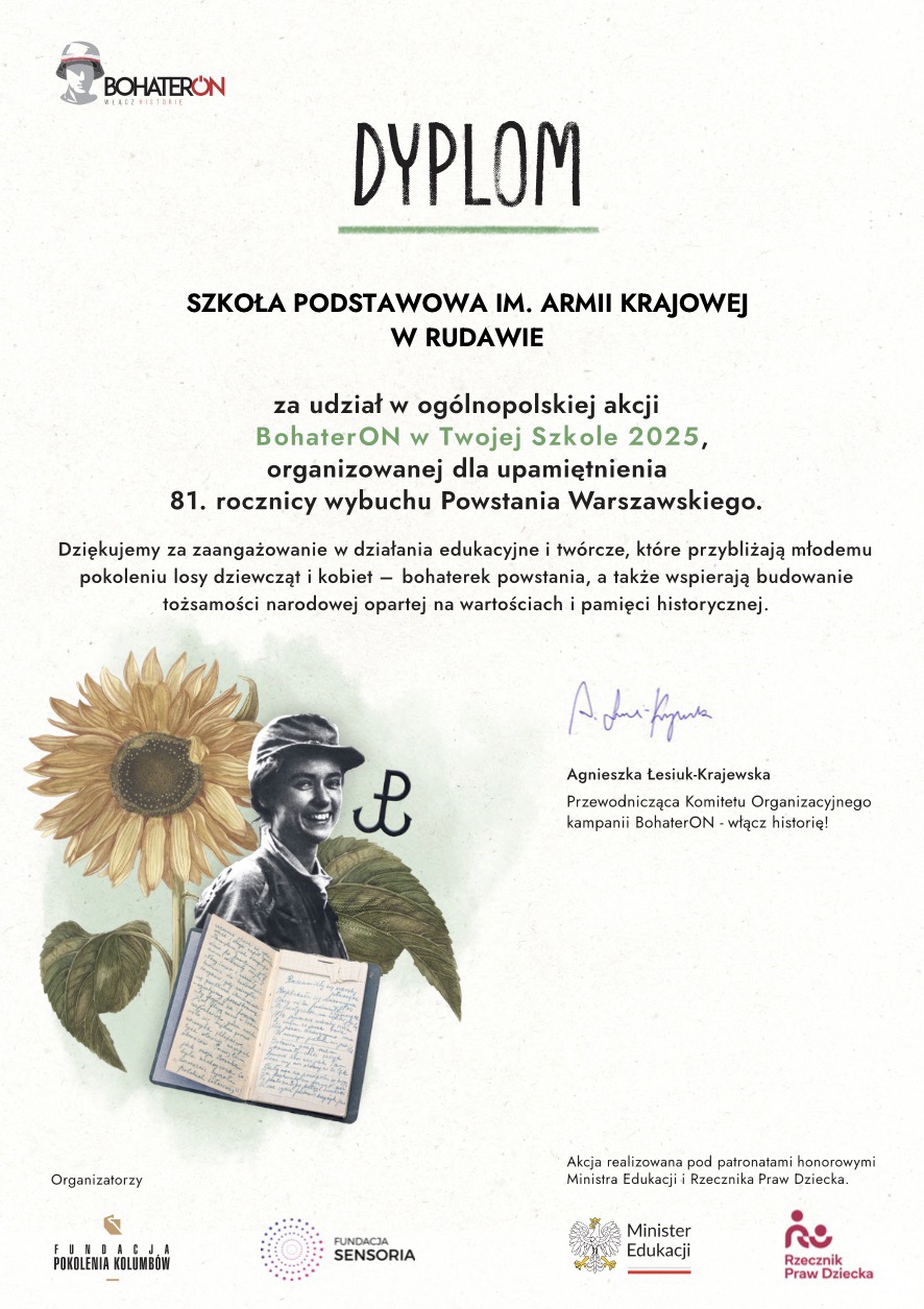 Klasa Ia, poprzez udzial w ogólnopolskiej akcji BohaterON w Twojej Szkole 2025, zdobyła dla naszej szkoły dyplom! Uczniowie w październiku mieli zorganizowaną lekcję historyczną dotyczącą losów dziewcząt i kobiet- bohaterek powstania (oprócz nauczyciela prowadził ją też uczeń- Paweł Bielak), była to lekcja budująca tożsamość narodową opartą na wartościach i pamięci historycznej. W ten sposób uczniowie upamiętnili 81. rocznicę wybuchu Powstania Warszawskiego. Chwała Bohaterom!